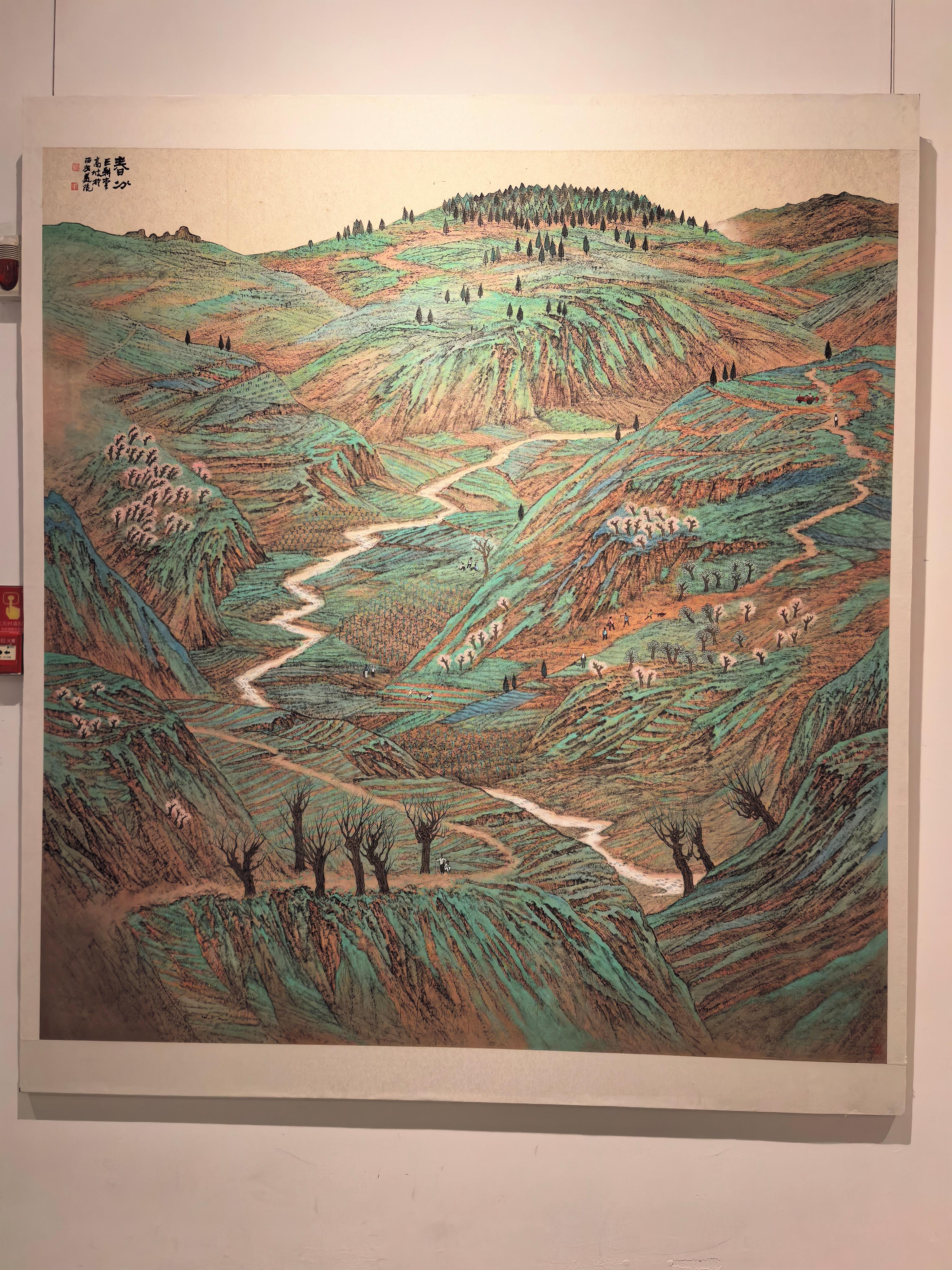 《香山新绿》《春分》《春风》等作品将水墨的苍润与青绿设色的明丽相结合,不仅描绘了层叠的黄土沟壑,还有山上泛红的杏花,新发的嫩芽带来的盎然绿意。这些画作传递出新时代黄土高原的绿化成果,打破观者对其“黄土遍地”的传统印象,展示出当地生态文明建设的卓越成就。